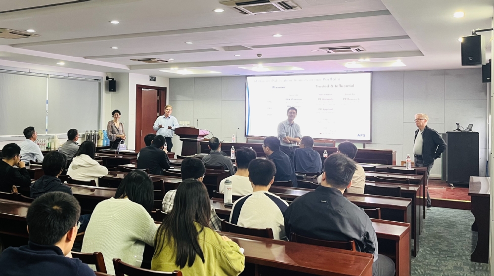 当天下午,团队成员访问物理科学与技术学院和软凝聚态物理及交叉研究中心。在物理科技楼与师生开展交流活动。美国物理学会执行主编 Dr. Jessica Thomas 和执行副主编 Dr. Athanasios Chantis 以“Advancing Physics Together: The Physical Review Journals and Scientists in China”为题,介绍了 APS 期刊的最新发展情况,并希望听取一线科研人员对期刊的期待和意见。会上,三位主编与中心多名参会师生深入讨论了写稿、投稿、送稿和审稿中存在的具体问题,特别是期刊评价指标和科学家学术评价中的一些长久存在的问题。访问结束后,美国物理学会主编团队对此次访问的成功举行表达了由衷的感谢,并对未来的合作充满期待。